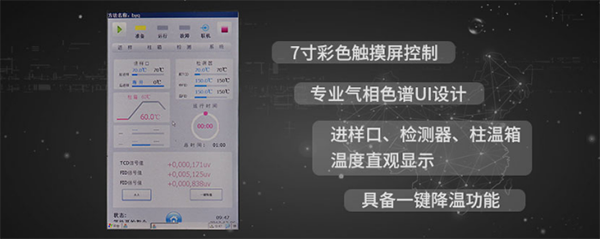 2、采用7寸彩色觸摸屏控制,專業(yè)色譜儀UI操作界面設(shè)計(jì),直觀反映進(jìn)樣口、柱溫箱、檢測器的內(nèi)部溫度值和個(gè)檢測器的數(shù)值,以及運(yùn)行時(shí)間,具備一鍵降溫功能,用戶可以自行設(shè)定檢測條件,使用及其方便。